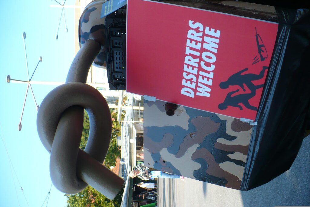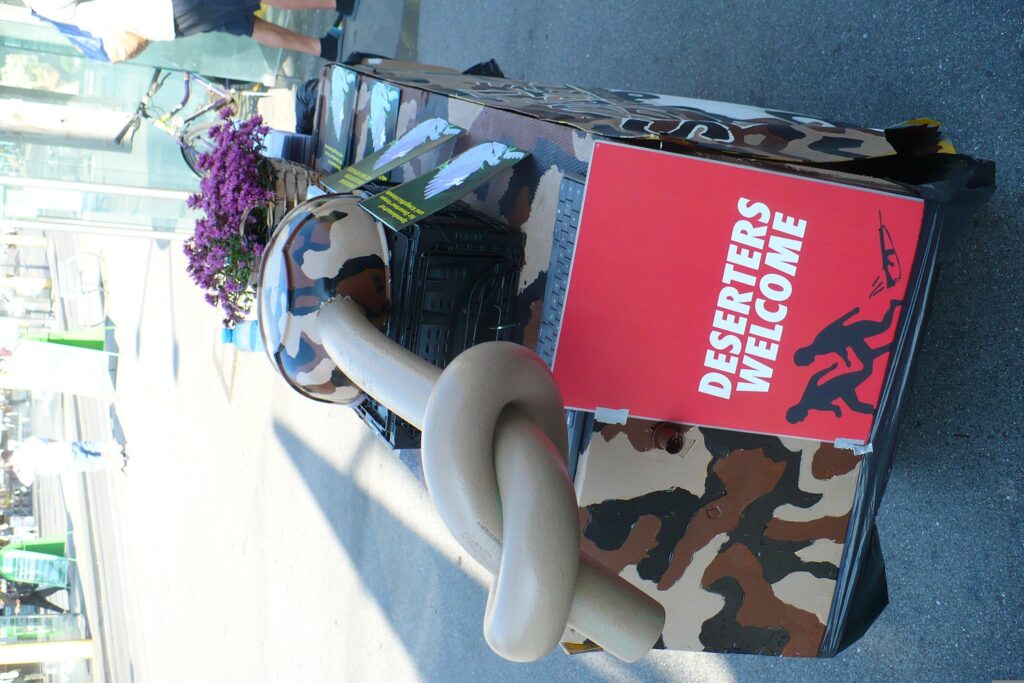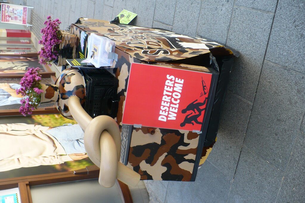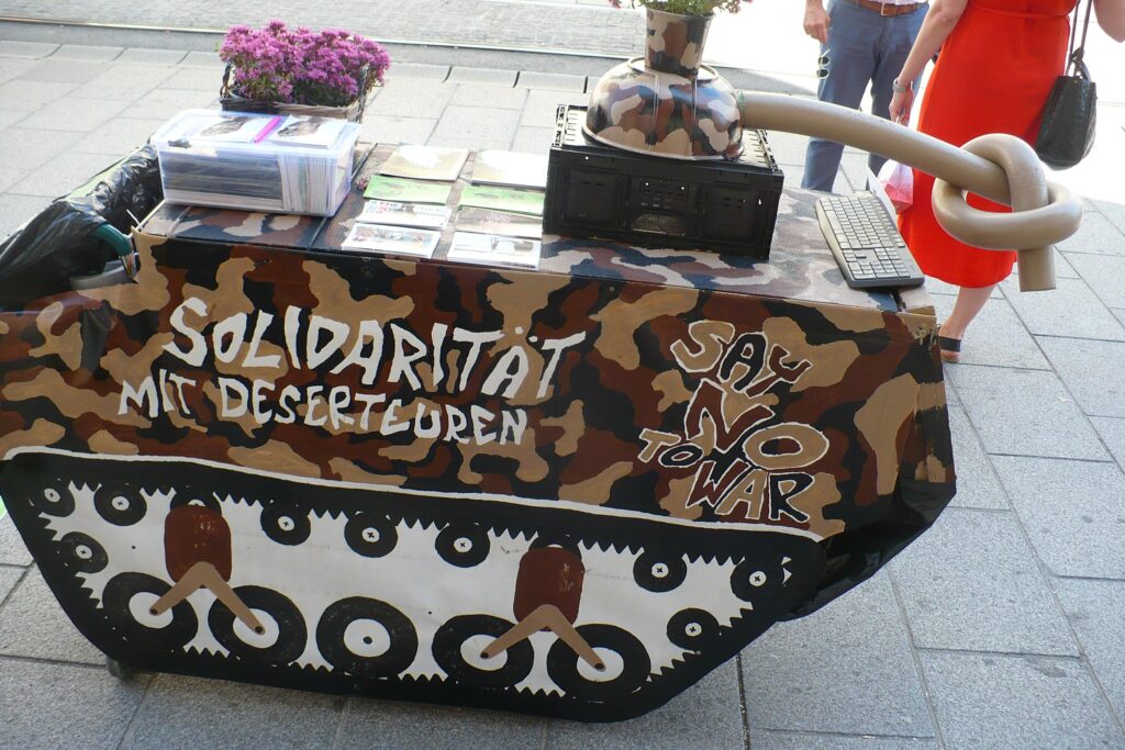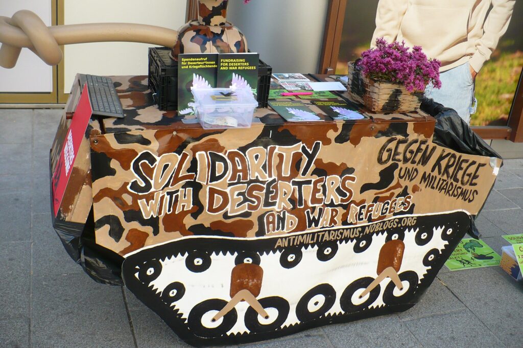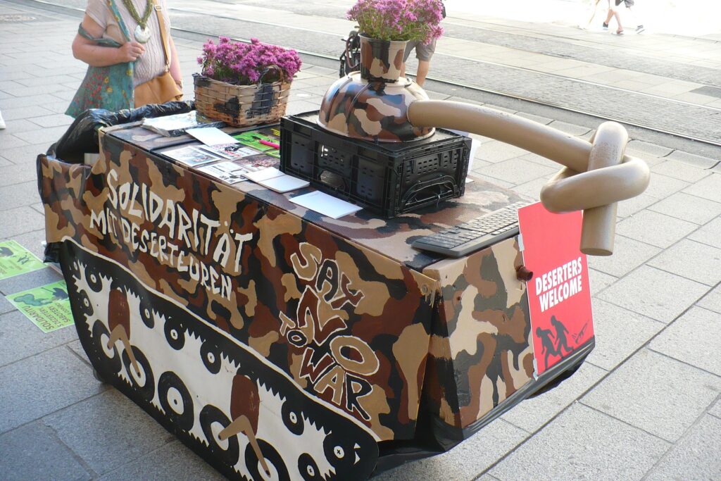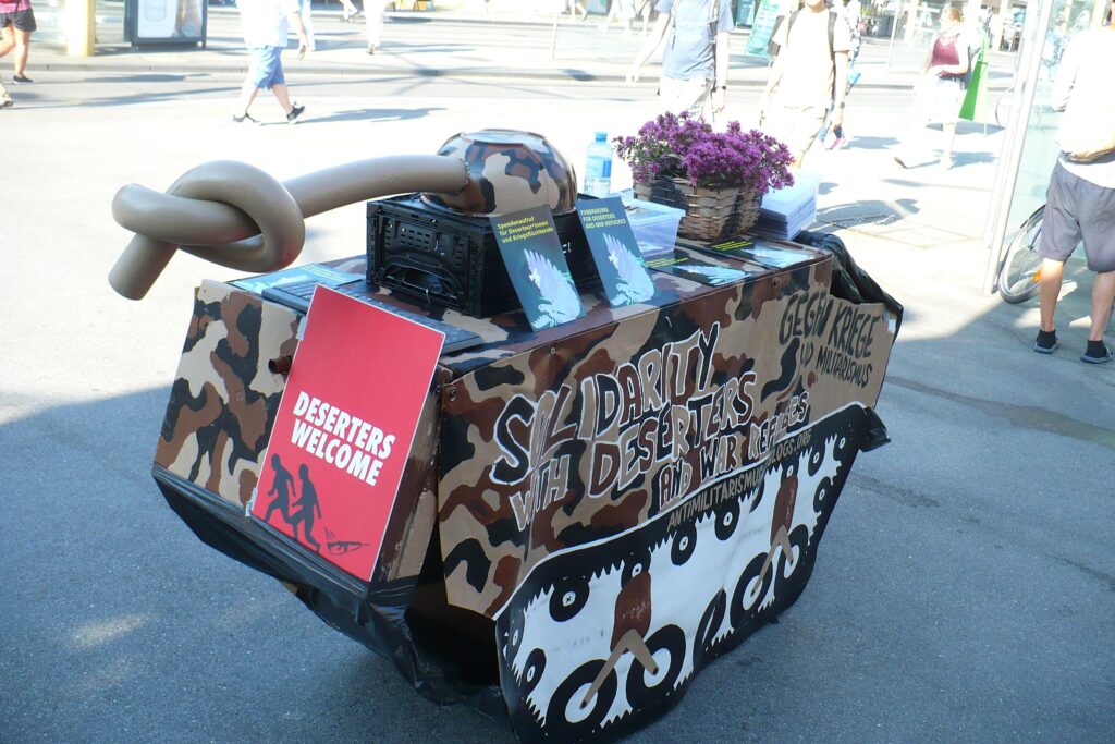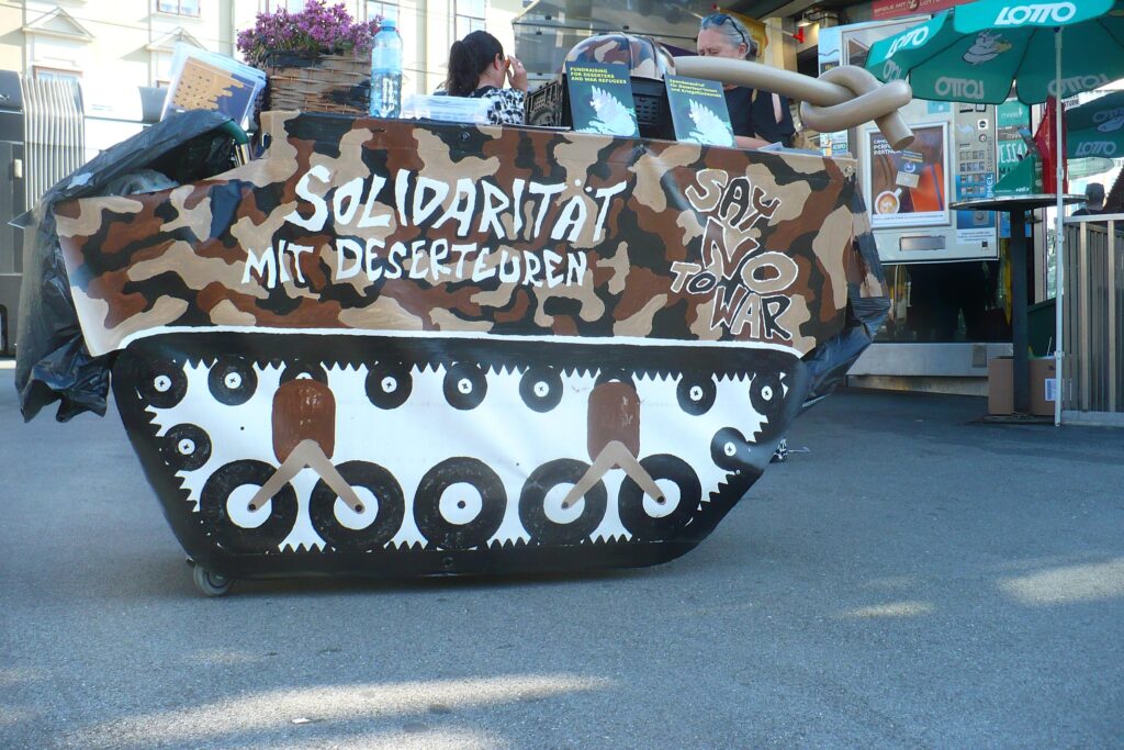 A tank is rolling through the streets of so-called Austria. But it won’t be going to war. Its cannon has been deformed so that it cannot kill. Its structure serves as a table for informational materials about a public collection for deserters and war refugees. This tank is not a machine for killing people; it is a symbol of resistance against the war machine, against military mobilization, and against the cult of militarism. Wherever this tank goes, it shares a clear message: Deserters, welcome!